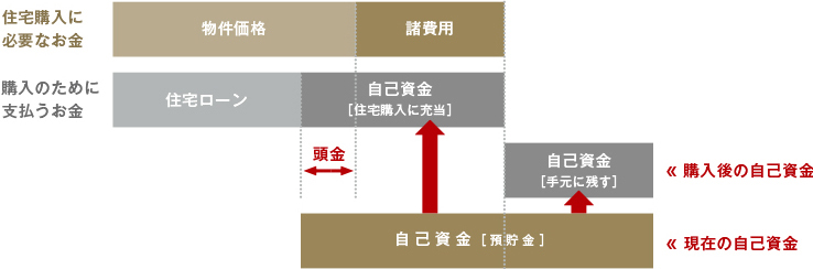 税金や登記費用、住宅ローン諸費用、仲介手数料などがかかります。預金 = 自己資金の総額 ー 当面の生活費等 ー 住宅購入にかかる諸費用